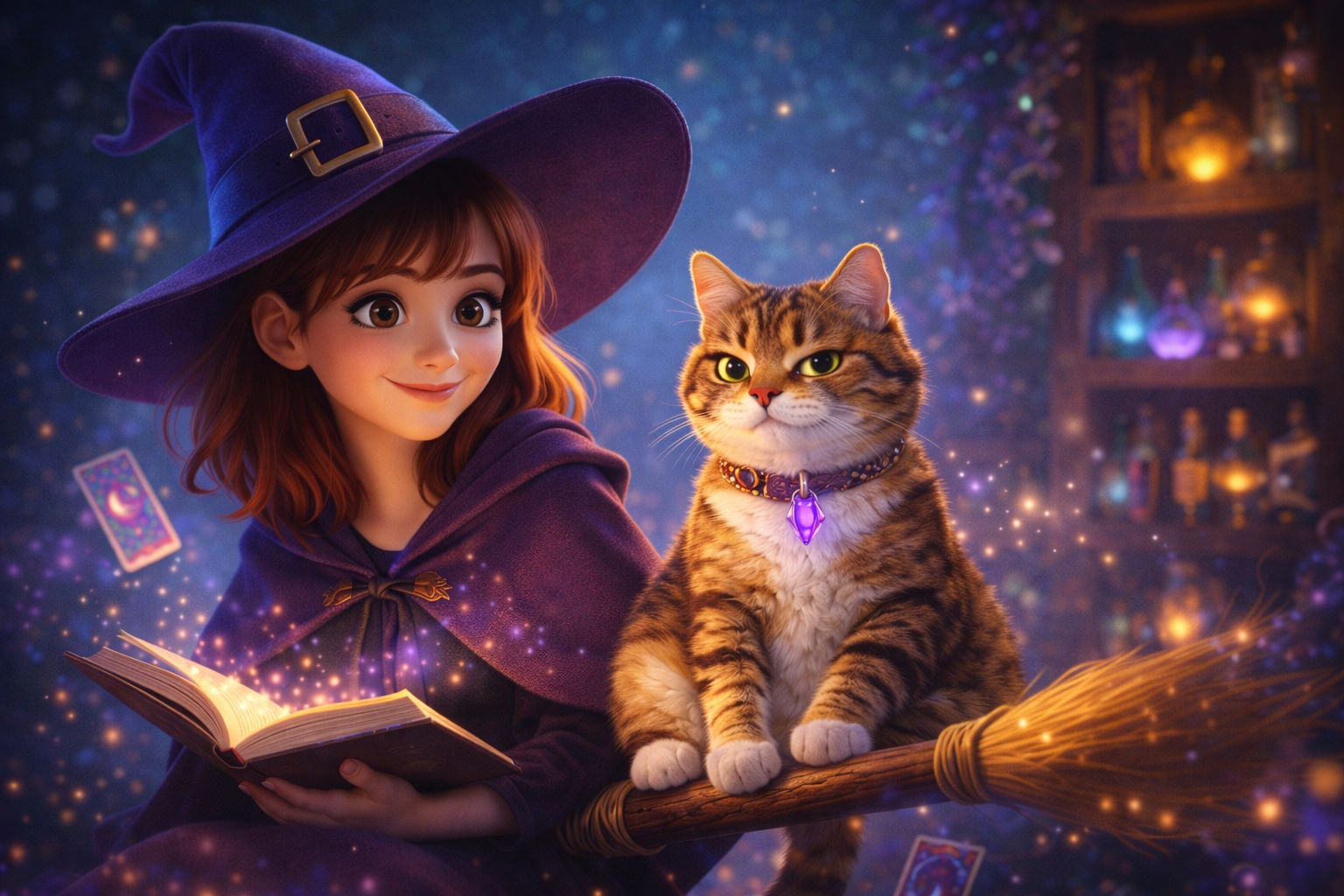 Иллюстрация в стиле современного 3D-арта Disney/Pixar или качественного цифрового арта. Человек с фото изображен в образе современной ведьмы или мага: узнаваемые черты лица сохранены в стилизованной интерпретации, характерной для Pixar. Рядом парит или сидит на метле кот, внешность которого стилизована под Pixar-персонажа на основе референса: сохранены общий окрас, рисунок и характерные черты мордочки в мультипликационной интерпретации, глаза большие и выразительные. На шее у фамильяра фиолетовый кулон-кристалл. Характер кота: хитрый и саркастичный, одна бровь приподнята, взгляд насмешливый. Вокруг героев магические искры, легкая мистическая дымка, летающие карты таро. Фон: таинственный лес с биолюминесцентными деталями или библиотека с зельями и светящимися склянками. Яркие, насыщенные цвета, мягкий объемный рендеринг. Формат: 4:5. Запрещается: фотореализм, скучные цвета, страшное или жуткое лицо, искаженные глаза, потеря узнаваемости персонажей, отсутствие магической атмосферы, обрезанные уши, зернистость, плохая композиция, темный неразличимый фон, водяной знак, текст.