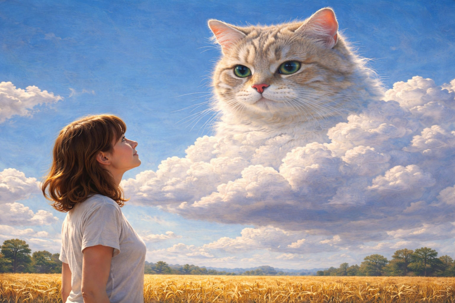 Над вами вместо облака парит огромный кот с белоснежной шерстью, плавно переходящей в кучевые облака. Поэтичная и немного абсурдная картина в духе великих сюрреалистов. Референс: фото человека.