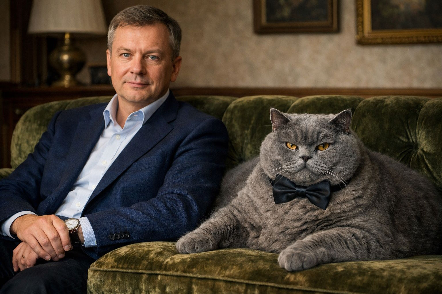 Классический портрет в интерьере, мягкий естественный свет. Человек с фото, максимально похожий на референс, с узнаваемыми чертами лица, сидит на винтажном бархатном диване — прямо, с достоинством. Рядом с ним вальяжно развалился очень толстый британский короткошерстный кот серо-голубого окраса. Питомец похож на меховой шар: щеки пышные, медно-золотые глаза с выражением осуждения и аристократического превосходства. На шее у животного идеально повязанный галстук-бабочка. Кот занимает непропорционально много места и выглядит так, будто именно он здесь хозяин. Фактура бархата дивана и плюшевой шерсти детально прорисована. Мягкий боковой свет из окна, теплые тени. Запрещается: худой или тощий кот, уличный или грязный кот, плохое освещение, неестественная поза, отсутствие галстука-бабочки, веселое или радостное выражение кота, искаженная мордочка, слияние кота с диваном, мультяшность, водяной знак, текст.