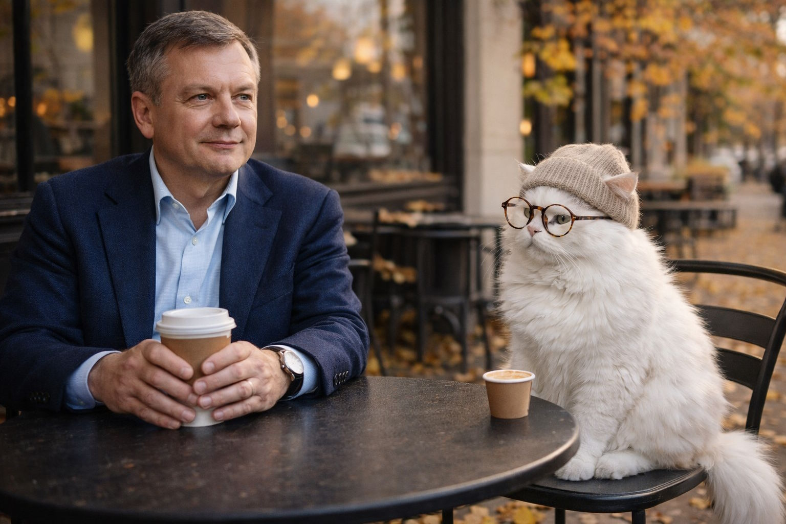 Уличная лайфстайл-фотография возле кофейни. Человек с фото, максимально похожий на референс, с узнаваемыми чертами лица, сидит за столиком на улице с кофе в руках. На соседнем стуле сидит белый пушистый кот в маленькой шапочке-бини и круглых роговых очках, надетых на нос. Очки держатся корректно, не вросли в мордочку, посажены естественно. Перед котом стоит маленький стаканчик с кофе. Животное сидит прямо, с достоинством, задумчиво смотрит вдаль — его поза интеллигентна и немного комична. Шерсть белоснежная и пушистая, хвост аккуратно свисает со стула. Осенняя атмосфера: желтые и оранжевые листья, мягкий рассеянный солнечный свет, теплые оттенки. Запрещается: кот без шапочки или очков, агрессивный или испуганный вид кота, летняя или зимняя обстановка, дождь, искаженные или вросшие в мордочку очки, неестественная посадка головы, слияние кота со стулом, мультяшность, водяной знак, текст.