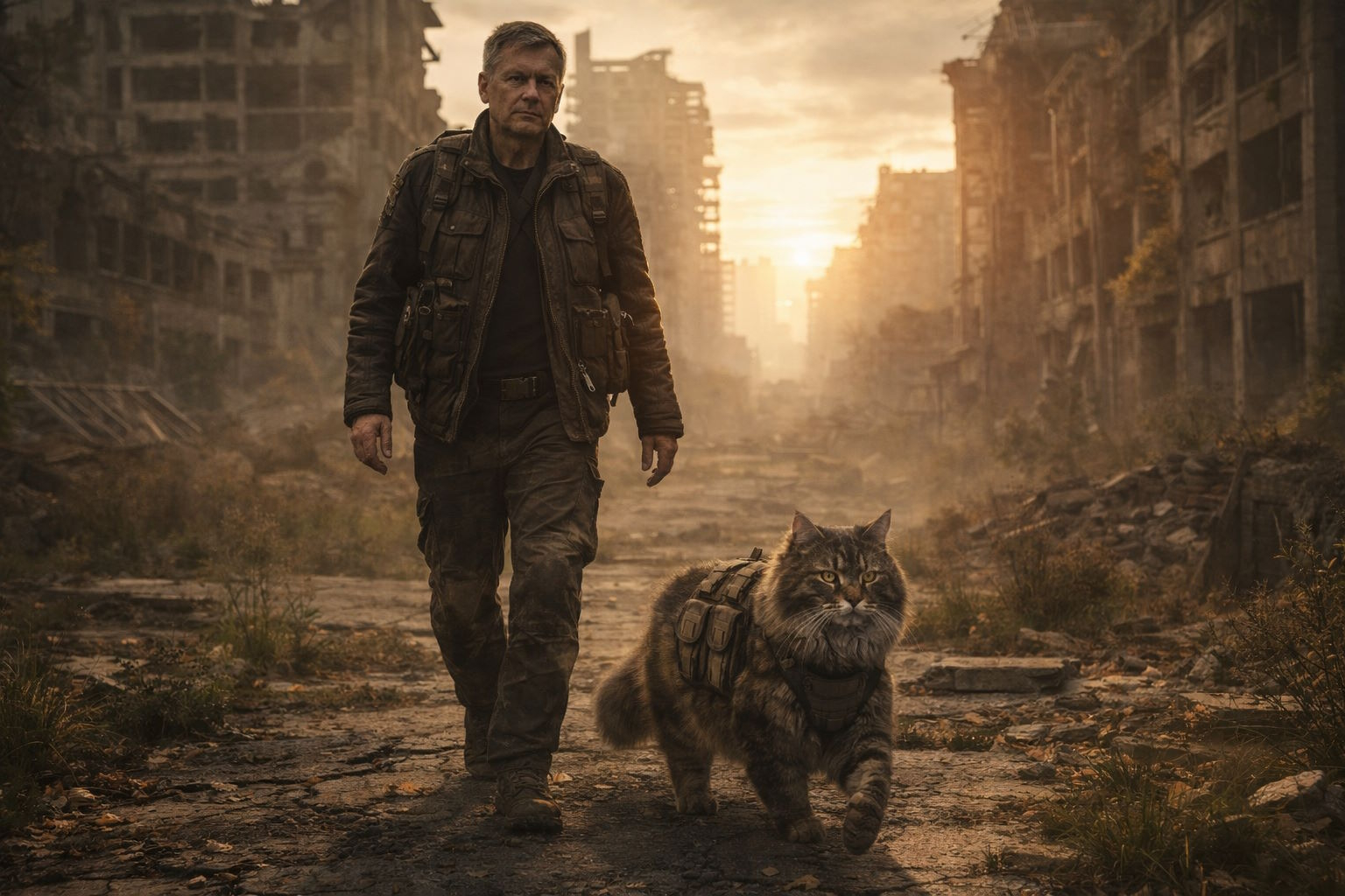 Кинематографичный кадр в жанре постапокалипсис, широкоформатный 16:9 или 21:9. Человек с референса, с узнаваемыми чертами лица, в потертой кожаной куртке с заплатками и тактическом рюкзаке идет по заросшим руинам города: потрескавшийся асфальт, проросшая сквозь него трава, разрушенные здания. У ног человека, уверенно шагая в ногу, идет крупный боевой кот породы Норвежская лесная. Шерсть животного густая, местами спутанная, окрас пятнистый табби-камуфляжный. На звере надета аккуратно подогнанная маленькая разгрузка с карманами. Над глазом у кота старый шрам. Взгляд кота суровый, сосредоточенный, защитный. Пыль в воздухе, теплые лучи заходящего солнца пробиваются сквозь руины. Эпичная атмосфера, стиль The Last of Us. Запрещается: чистая или целая одежда, гламурная обстановка, студийный свет, милый домашний кот без шрамов или разгрузки, яркие насыщенные цвета, улыбка, искаженное лицо, мультяшность, аниме, водяной знак, текст, логотип.