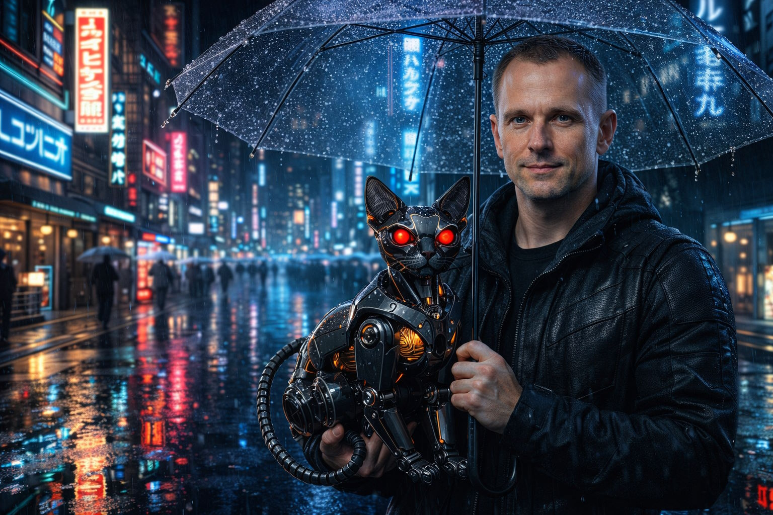 Футуристический фотореалистичный арт, вертикальный формат 9:16. Человек с референса, с узнаваемыми чертами лица, стоит под прозрачным зонтом посреди ночной улицы футуристического Токио. Неоновые вывески на японском и английском языках отражаются в мокрых лужах на асфальте. На руках у человека сидит полностью механический кот-робот — компактный, изящный, с кошачьими пропорциями. Корпус кота выполнен из черного глянцевого металла и матового карбона: четкие геометричные панели, видимые стыки и сочленения. Сквозь прозрачные детали суставов и грудной клетки видны светящиеся оранжевые провода и миниатюрные схемы. Хвост кота — гибкий металлический, с сегментами; голова робота имеет кошачью форму: заостренные уши, четкий силуэт; глаза — два объектива камер, светящихся красным. Кот смотрит прямо на зрителя. Капли дождя стекают по зонту и по металлическому корпусу робота-питомца. Высочайшая детализация механизмов, металла и отражений. Запрещается: живой кот, шерсть, органические детали, дневной свет, сухая погода, простой или нейтральный фон, искаженные механизмы, плохая геометрия корпуса, размытое лицо человека, аниме-стиль, мультипликационный стиль, водяной знак, текст, логотип.