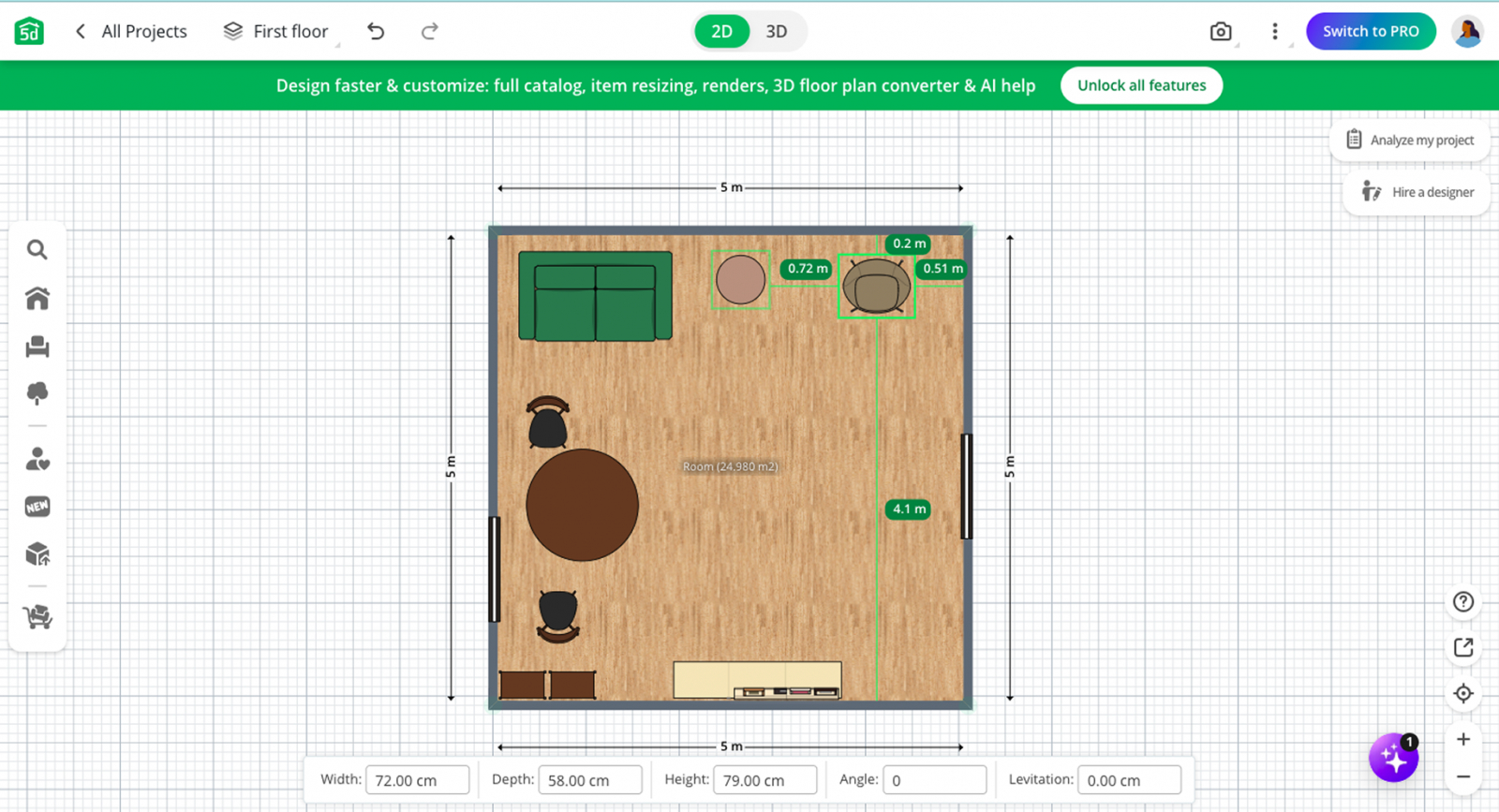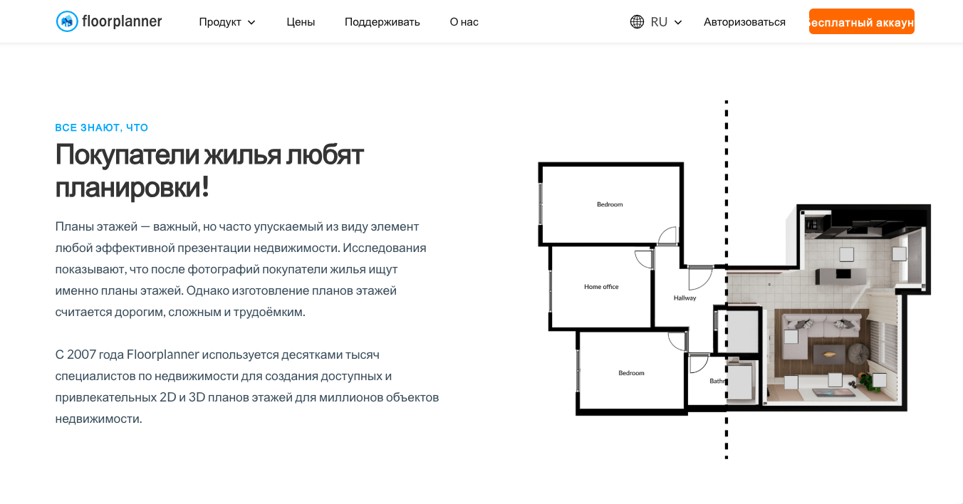 Здесь всё работает онлайн, объекты добавляете простым перетаскиванием, а 3D-вид включаете в один клик. Подходит дизайнерам, риелторам и застройщикам, которым важна скорость и наглядность.