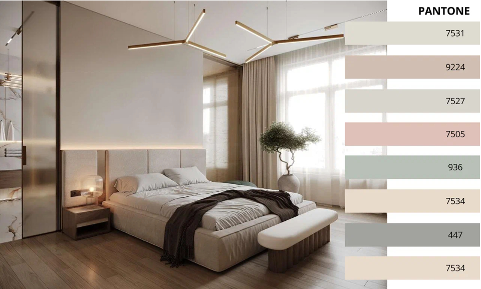 Добавьте детали и эмоцию. Финальный штрих в программе для создания дизайна комнаты — ощущение жизни. Вставьте палитру Pantone, подпишите материалы: «лен», «дуб натуральный», «микроцемент». Добавьте лёгкую тень или эффект бумаги — в Canva это делается фильтром Shadows.