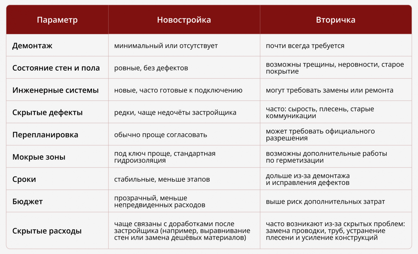 Ремонт под ключ в СПб в новостройке и во вторичке различается. В новостройке обычно нет старых коммуникаций и дефектов стен, но есть риск скрытых недочётов от застройщика, мокрые зоны и точная планировка. Во вторичке почти всегда нужен демонтаж старой отделки, выравнивание стен и пола, проверка инженерки, а иногда и перепланировка, что может сильно увеличить бюджет.