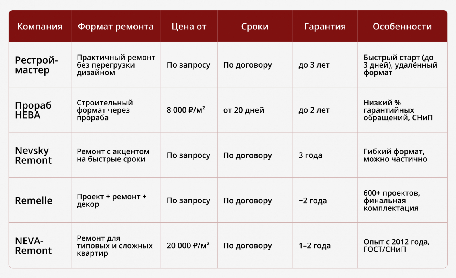 Как выбрать надёжную компанию по ремонту квартир в Санкт-Петербурге и не столкнуться с доплатами, срывом сроков и переделками? В рейтинге собрали проверенных подрядчиков. Это топ подрядчиков для ремонта квартиры под ключ в СПб. Разбираем, что входит в работы и какие документы требовать: смета, график, акты, гарантия. Так вы быстрее выберете надёжную компанию для ремонта без лишних рисков.