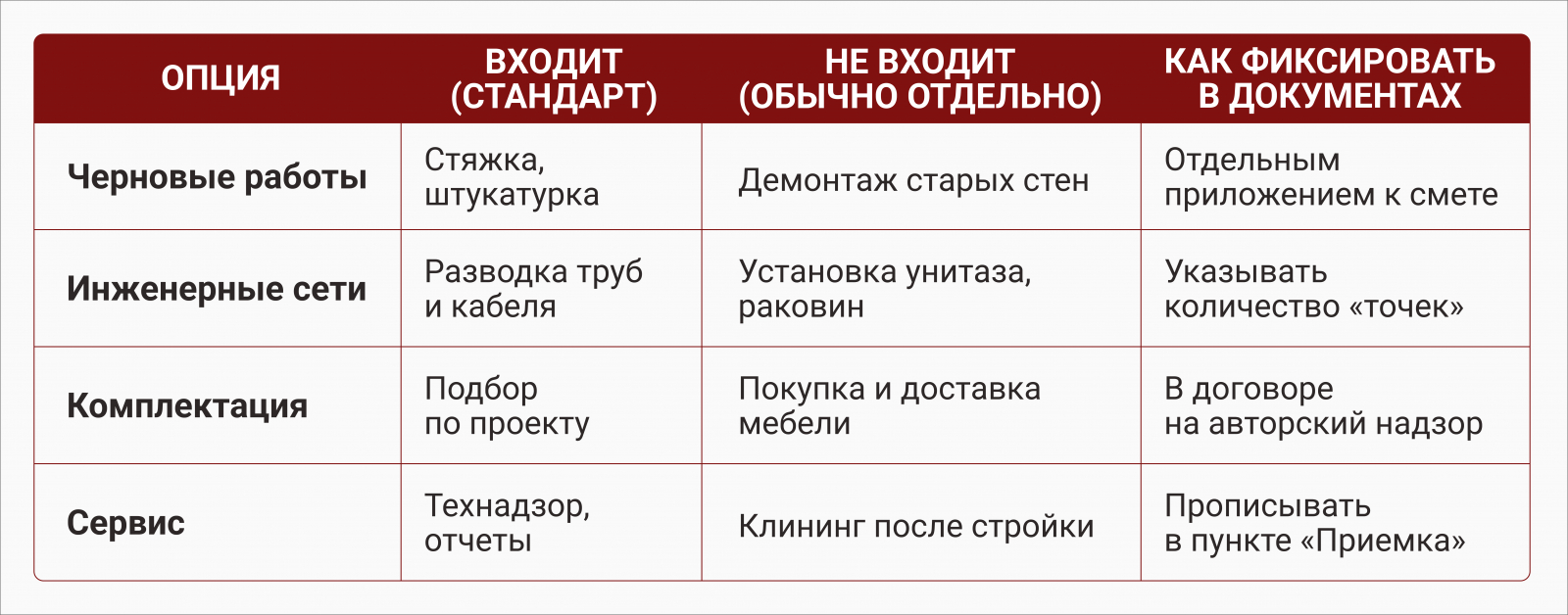 Ниже приведена таблица-шпаргалка, которая поможет сравнить предложения разных фирм и не переплатить за то, что «забыли» включить в прайс.