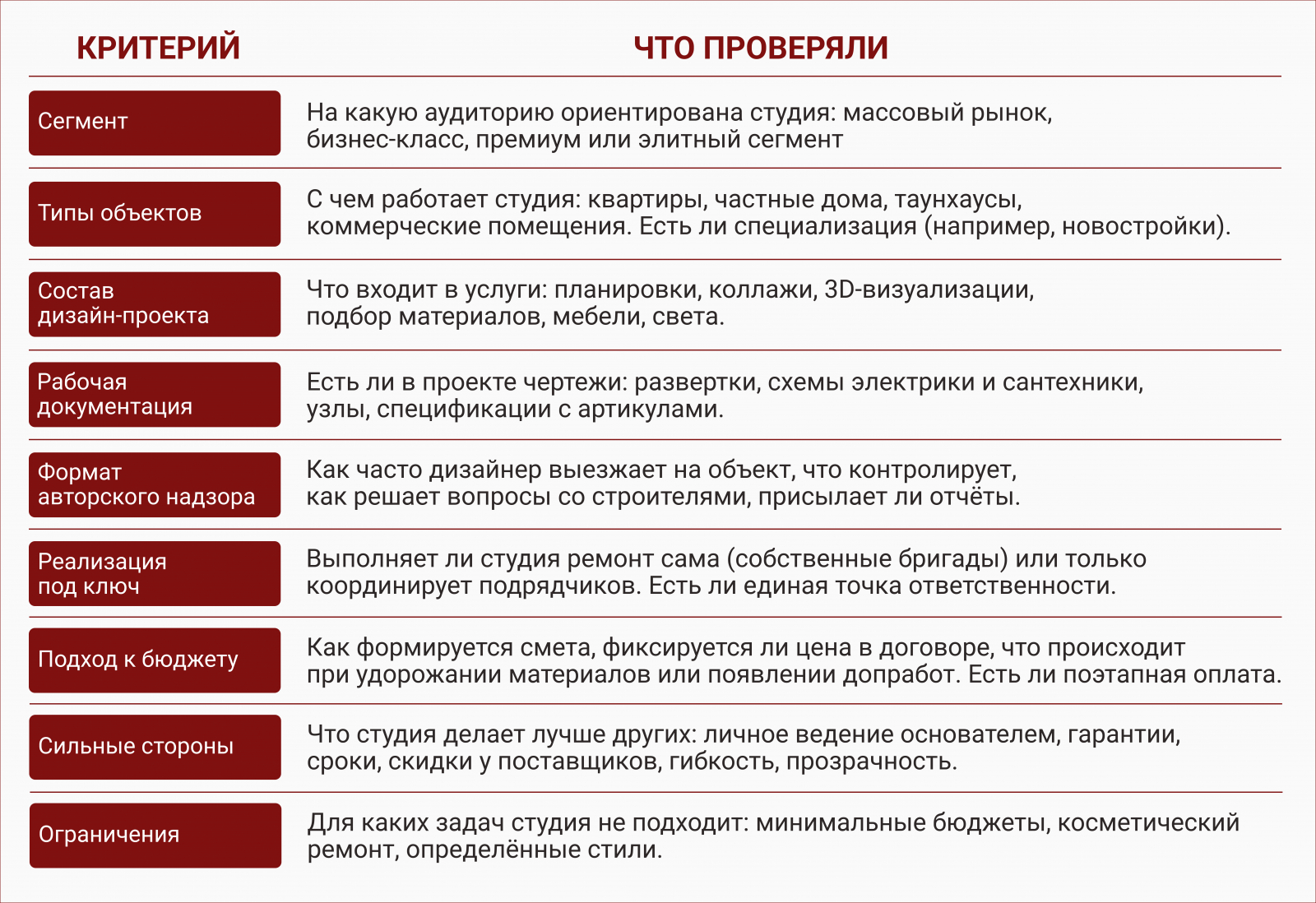 3. Методика рейтинга: по каким критериям оценивались студии дизайна интерьера Москвы?