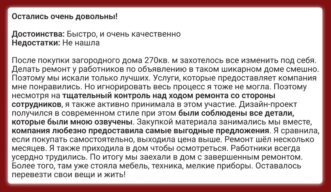 Сильные стороны: полное сопровождение, закупка материалов с выкупом остатков, фотоотчёты.