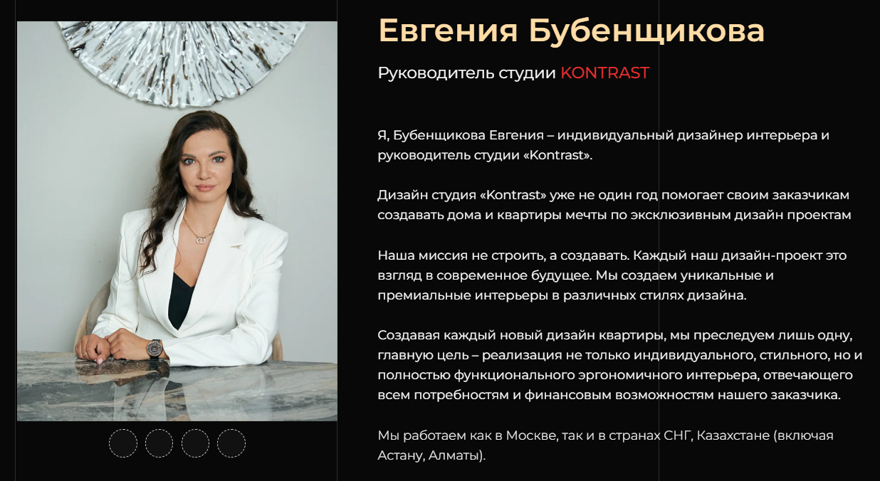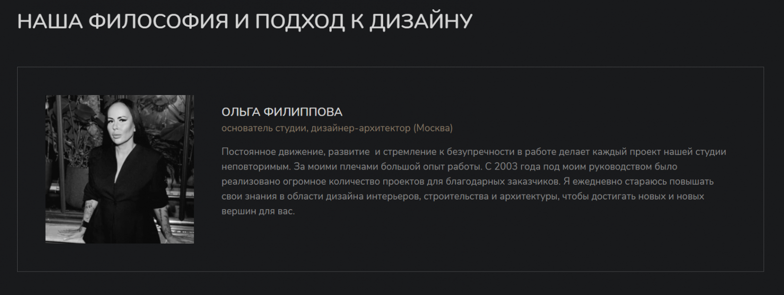 Команда сочетает европейские традиции с креативом. Философия — превратить современное пространство в произведение искусства, комфортное для жизни конкретного человека. Основательница — дизайнер-архитектор с опытом с 2003 года.