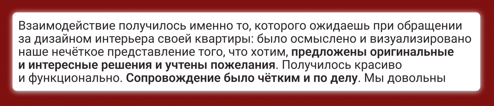 Пример. Нужно найти исполнителя для дизайна двушки в новостройке. Из пяти отобранных компаний, две работают только с визуальной частью, три — с полным циклом. После запроса чертежей, одна присылает планировки и визуализации, другая — полный альбом с развертками, спецификациями и узлами. На встрече со вторым кандидатом вам показывают объекты в работе, объясняют, как контролируют стройку. Если чувствуете, что с ним комфортно и понятно. Бинго! Вы нашли надежных ребят.