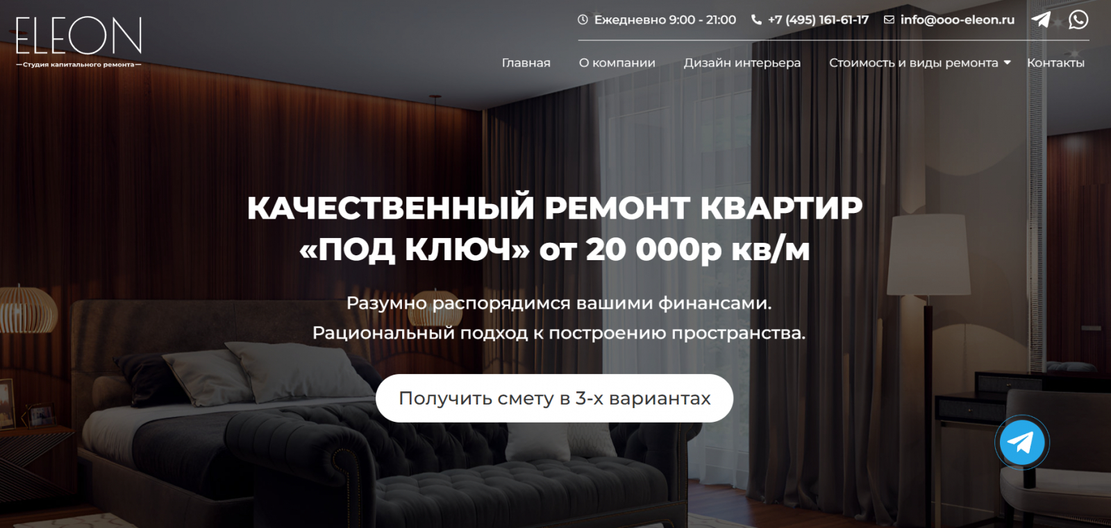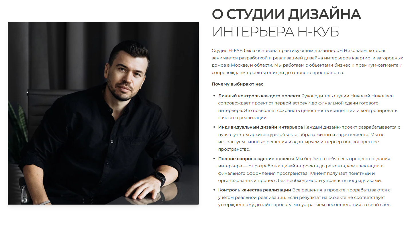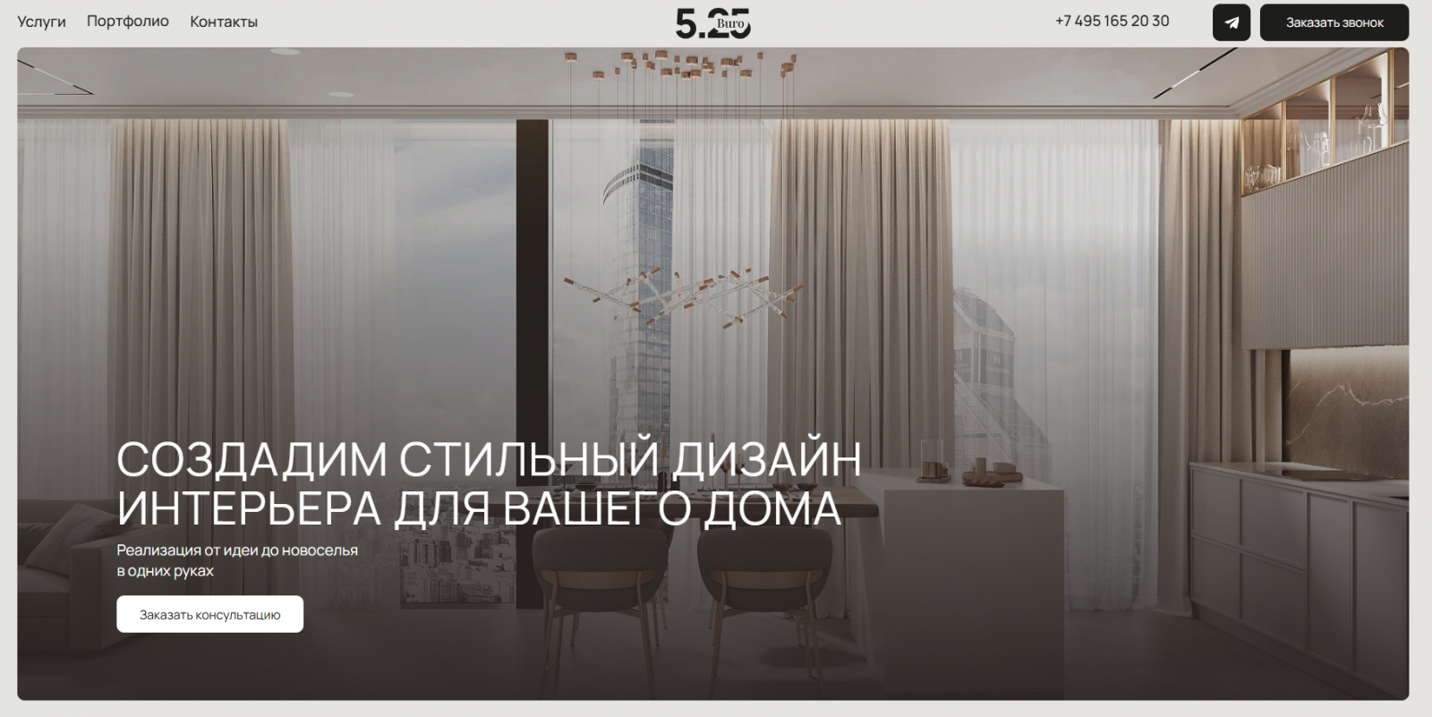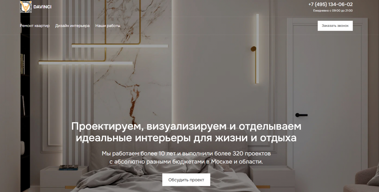 Ключевое обещание: создание стильного дизайна с реализацией «под ключ» и гарантией на работы до 5 лет.
