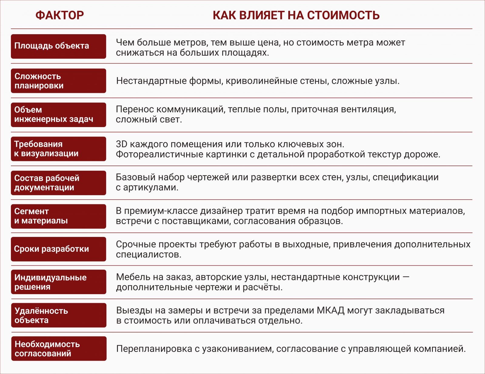 Стоимость считают по-разному: одни берут фиксированную ставку за метр, другие оценивают каждый объект индивидуально. Также влияет сегмент — в премиуме уходит больше времени на подбор материалов, встречи с поставщиками и согласования. И конечно, сроки: чем быстрее нужно закончить, тем выше стоимость из‑за срочности и дополнительных подрядчиков.