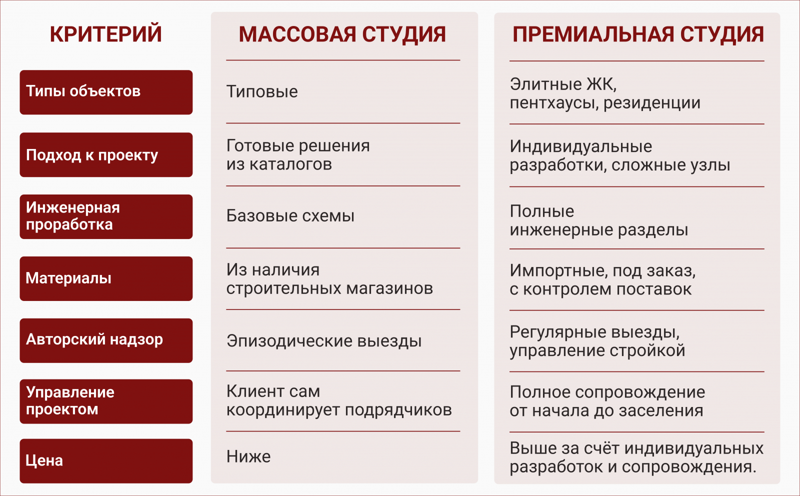 Премиальная работает с элитными ЖК, загородными резиденциями, пентхаусами. Здесь продумывают нестандартные индивидуальные решения, делают сложные инженерные схемы и ведут проект от первой встречи до заселения. Массовая — создает пространства, в которых удобно и приятно жить.