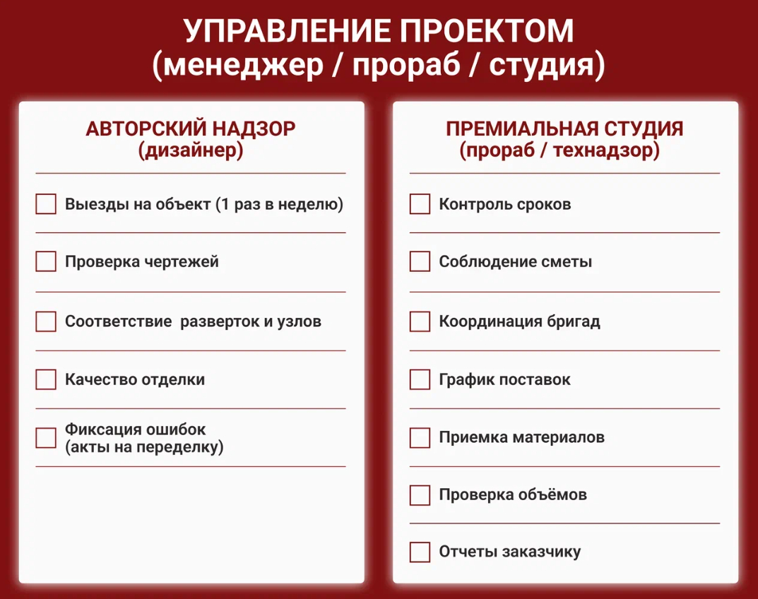 Формат авторского надзора: контроль реализации, координацию поставок, закупка материалов, управление подрядчиками, проверка качества, соблюдение сроков.