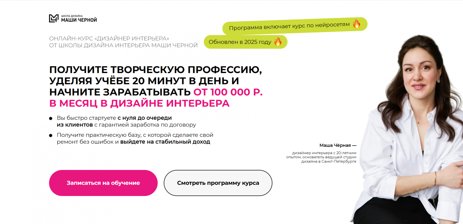 1. «Лёгкий старт в дизайне интерьера» — Школа Маши Черной. Маша Черная, дизайнер с 20-летним опытом, ведёт живые эфиры (дневные и вечерние). Внутри: алгоритм старта, создание дизайна в телефоне, разработка концепции интерьера, разбор бюджетов ремонта и дорожная карта первых заказов. Плюс — сертификат на скидку, урок по визуализации с ИИ, авторская книга Маши и многое другое.
