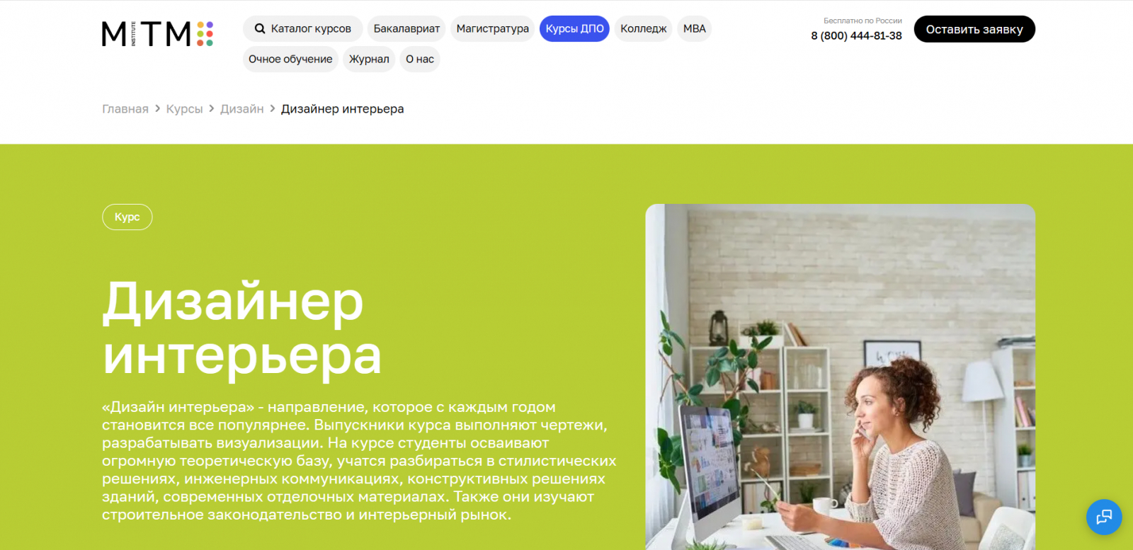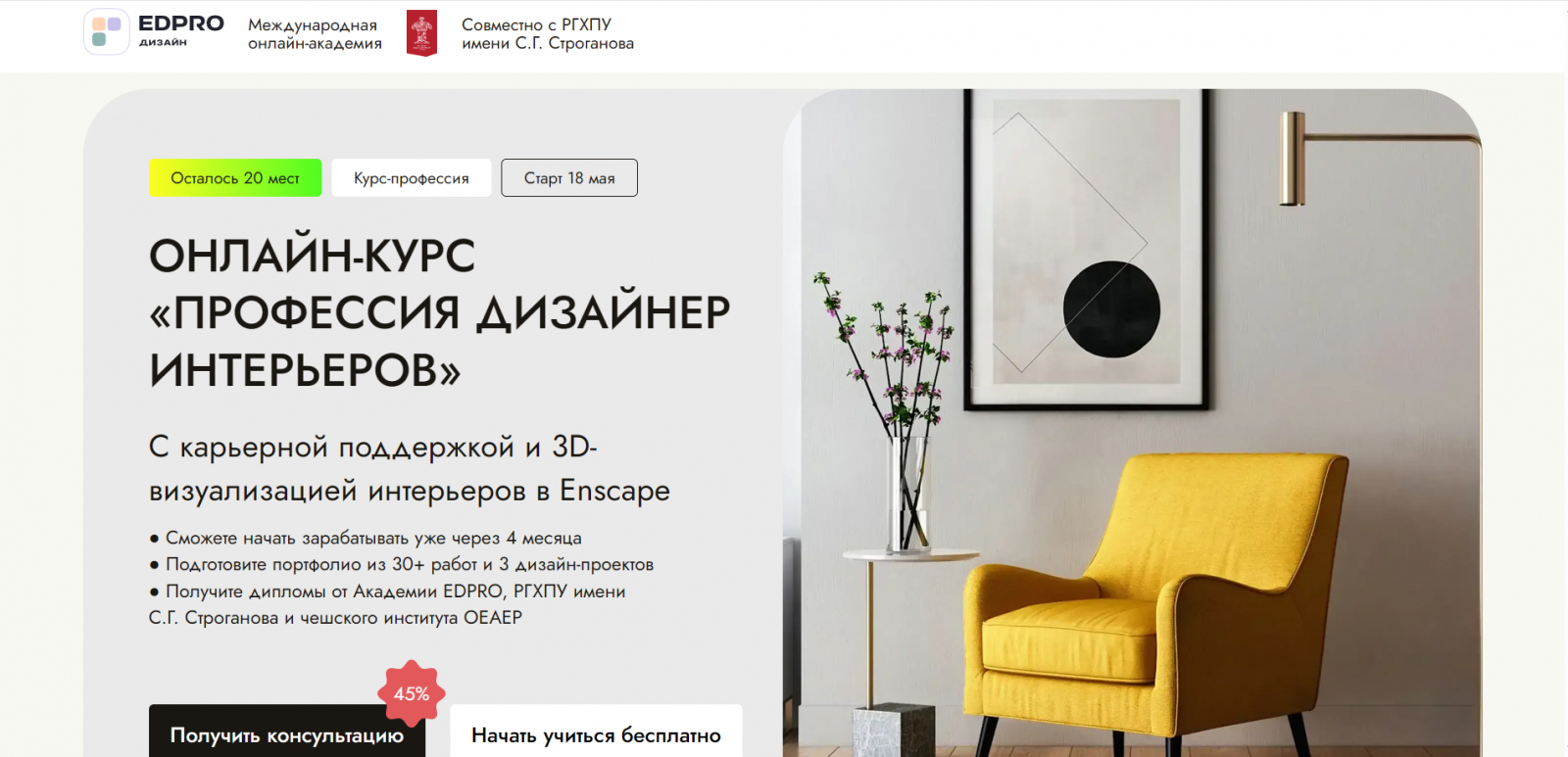 11. «Профессия Дизайнер интерьера» — Международная школа профессий. 20 недель онлайн, ArchiCAD, Photoshop, 3ds Max + AutoCAD в подарок. На выходе диплом и портфолио. Можно оплатить маткапиталом или соцконтрактом. Нюанс: доступ к курсу всего на 3 месяца.