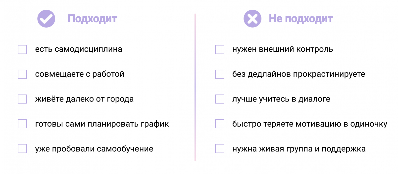 Подходит: занятым людям, которые ценят свободу графика. Если у вас разрозненные знания и нужно системно освоить профессию без привязки к расписанию.