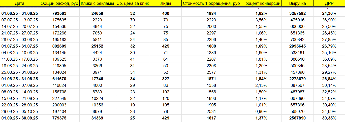 Видно, что в июне наша выручка составляла 3 257 592 рубля и ДРР 24%. А с июля начала постепенно уменьшаться, а в августе составила вообще 2 278 000 рублей. Если даже выручка уменьшается, обычно ДРР остается таким же. В сентябре спрос немного увеличился, но и ДРР тоже, а выручка не сильно изменилась.