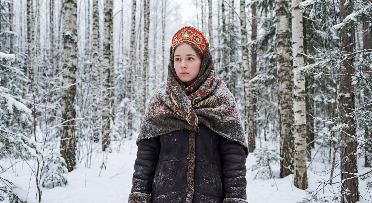 Portrait of a young woman in traditional Russian style, winter forest, snow-covered trees, red kokoshnik and wool shawl, natural daylight, soft shadows, realistic photography, cinematic mood, high detail, no fantasy elements