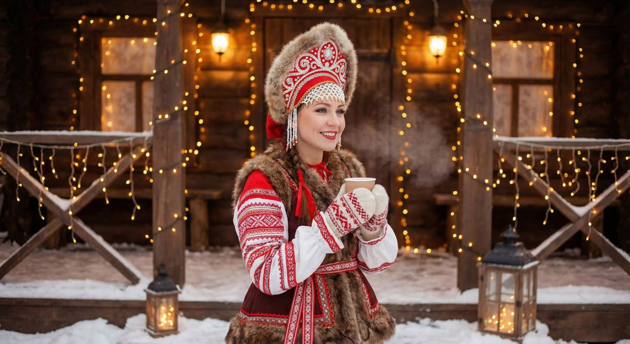 Стиль «настроения» и мимолетного момента. В таких генерациях мы не стремимся показать костюм во всех деталях, а фокусируемся на передаче эмоций и духа русской природы. Это визуальная поэзия: едва заметный пар изо рта на крепком морозе, ярко-красные ягоды рябины, припорошенные первым снегом, мягкие блики на медном самоваре во время уютного чаепития.