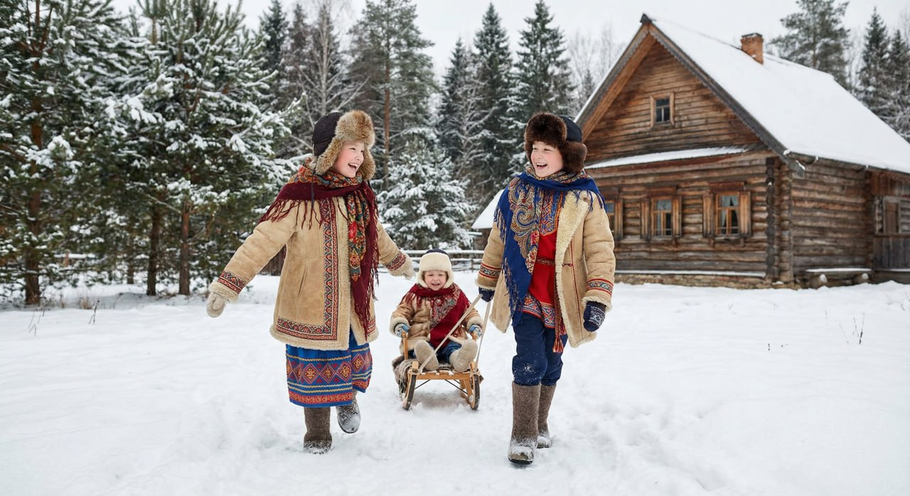 Children photoshoot in Russian folk style, winter setting, warm clothing, traditional patterns, natural smiles, soft light, realistic photography, family-friendly mood