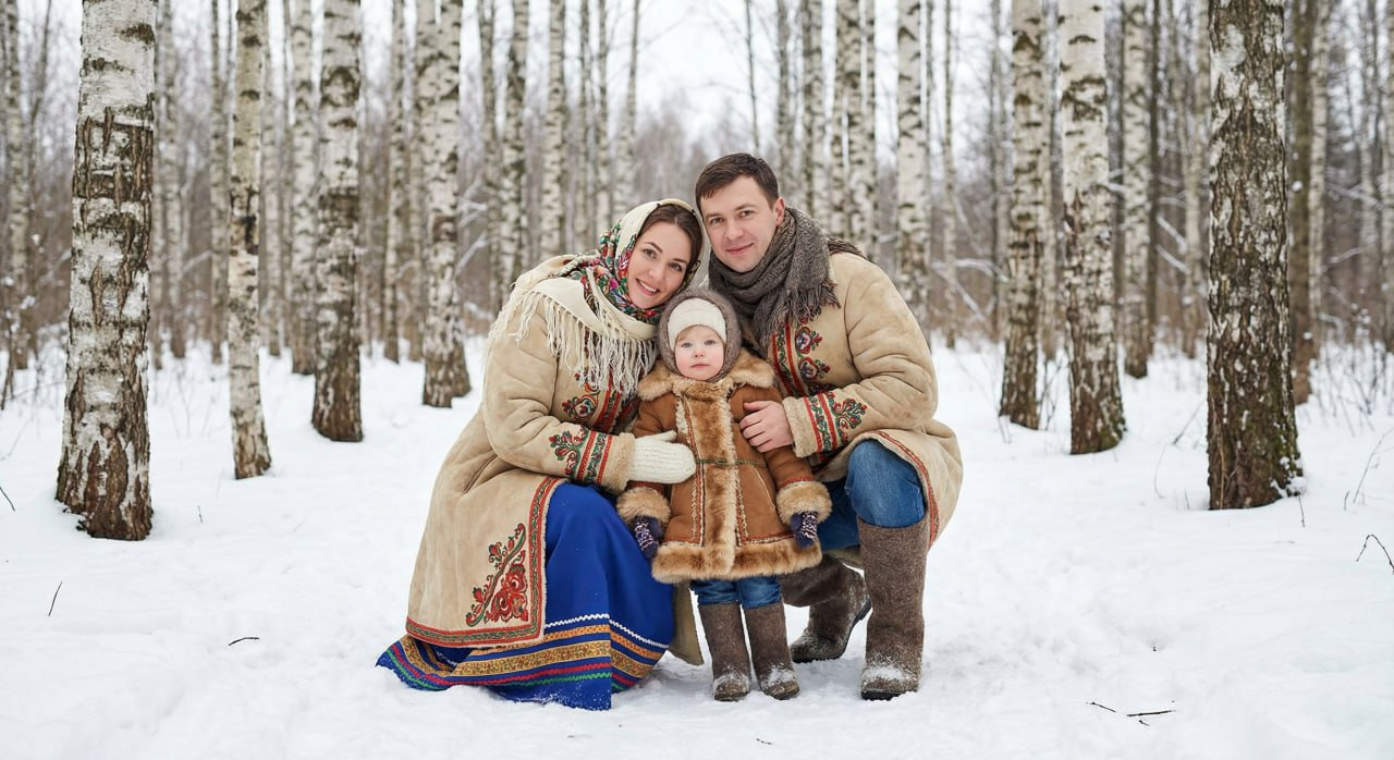 Family photoshoot in Russian style, winter outdoors, parents and child in traditional clothing, calm composition, natural light, realistic family portrait