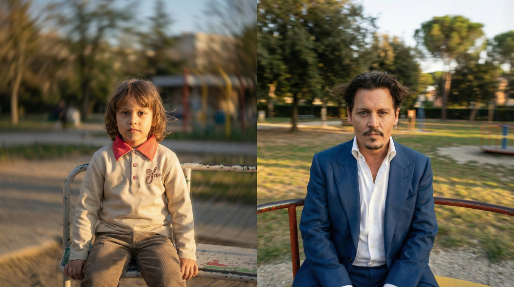 Критически важно: НЕ используйте ИИ-омоложение! Берите реальное детское фото. Искусственное омоложение даёт кукольный эффект вместо живой ностальгии.