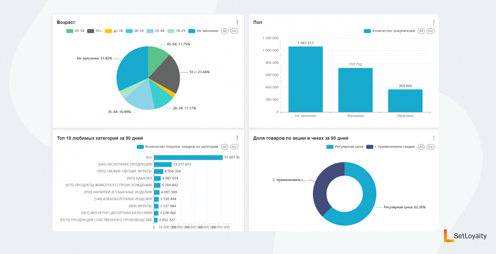 В одном месте собрана вся база: средний чек, возраст, пол, любимые категории и доля покупок по акциям. За пару минут можно понять, кто ваша аудитория и как она себя ведет. Плюс — дашборд уже есть в базовой лицензии: достаточно обновиться и можно сразу пользоваться.
