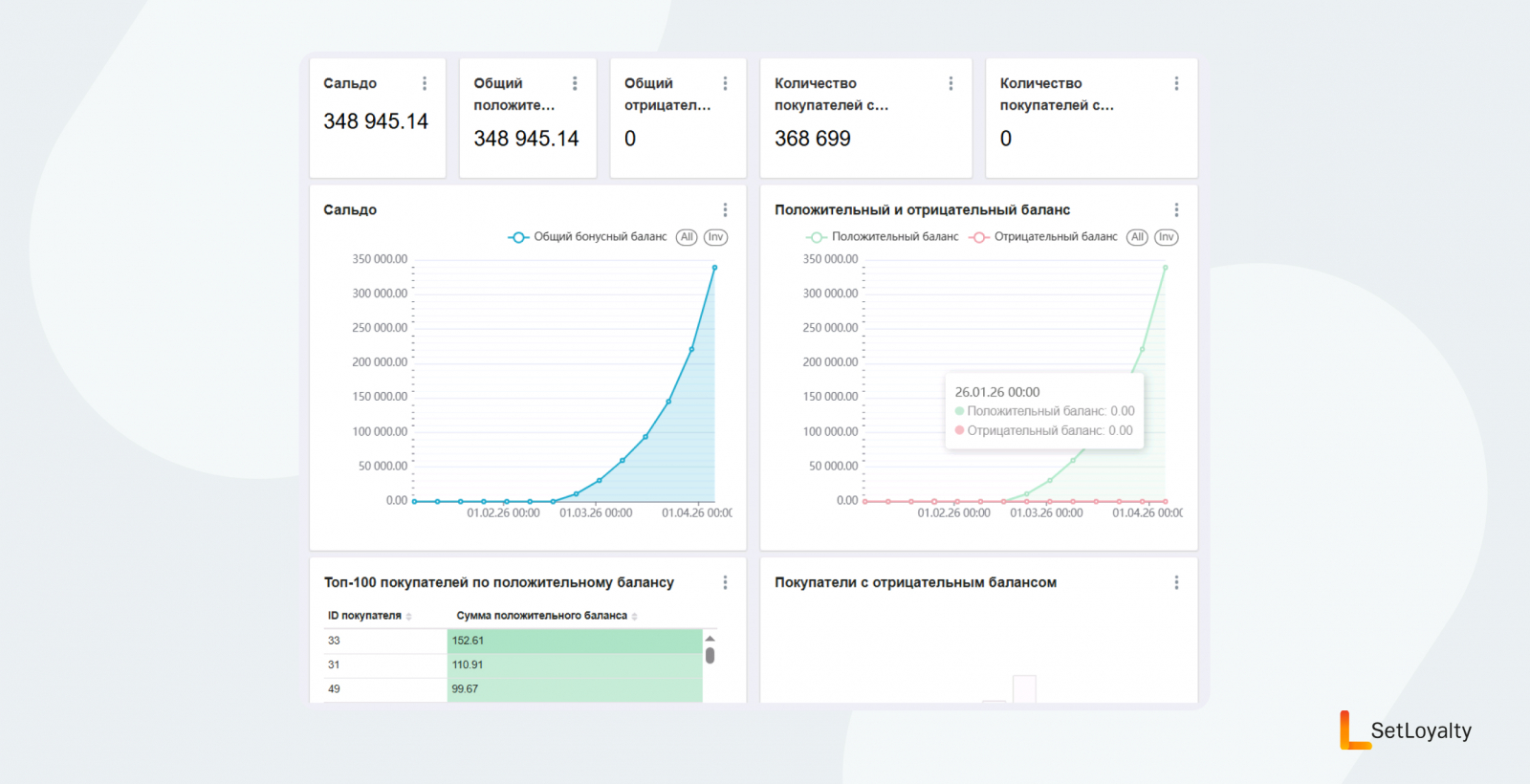 Чтобы это не терять из виду, добавили отдельный дашборд. Он показывает, сколько клиентов с отрицательным балансом, кто они и какой общий объем «бонусного долга» накапливается. Так проще контролировать ситуацию и понимать, как такие кейсы влияют на программу лояльности.