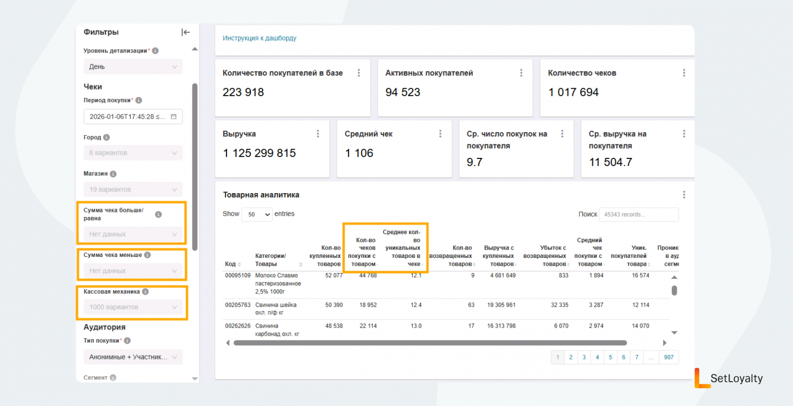 Добавили фильтры по сумме чека и точнее проработали период: теперь учитывается время покупок, есть детализация вплоть до часа. Можно увидеть пики продаж и распределение нагрузки и уже на основе этого планировать акции и работу магазинов.