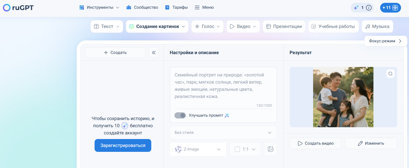 ваши идеи в готовые изображения по специальному промту для фото поколений;