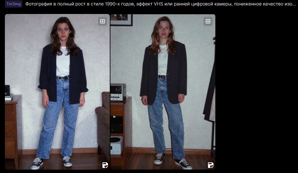 Фотография в полный рост в стиле 1990-х годов, эффект VHS или ранней цифровой камеры, пониженное качество изображения, легкий шум, холодные оттенки, повседневная одежда 90-х, неидеальная композиция, ощущение домашнего архива или старой видеокассеты.
