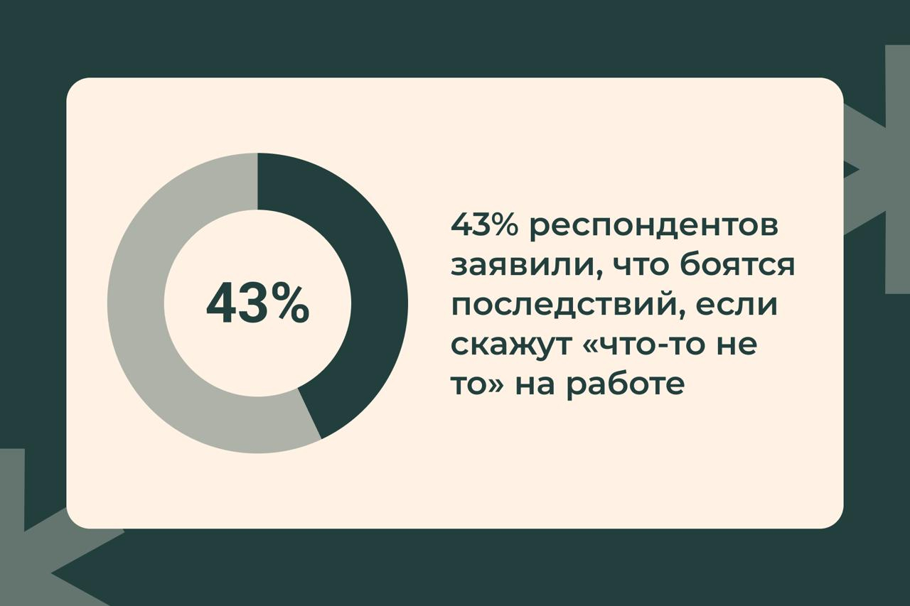 По данным исследования Института деловой этики, в опросе 43% респондентов заявили, что боятся последствий, если скажут «что-то не то» на работе — то есть репрессивных реакций или увольнения. И это подтверждает ощущение, которое есть у многих сотрудников: «Компании и руководителю можно, а мне нет».