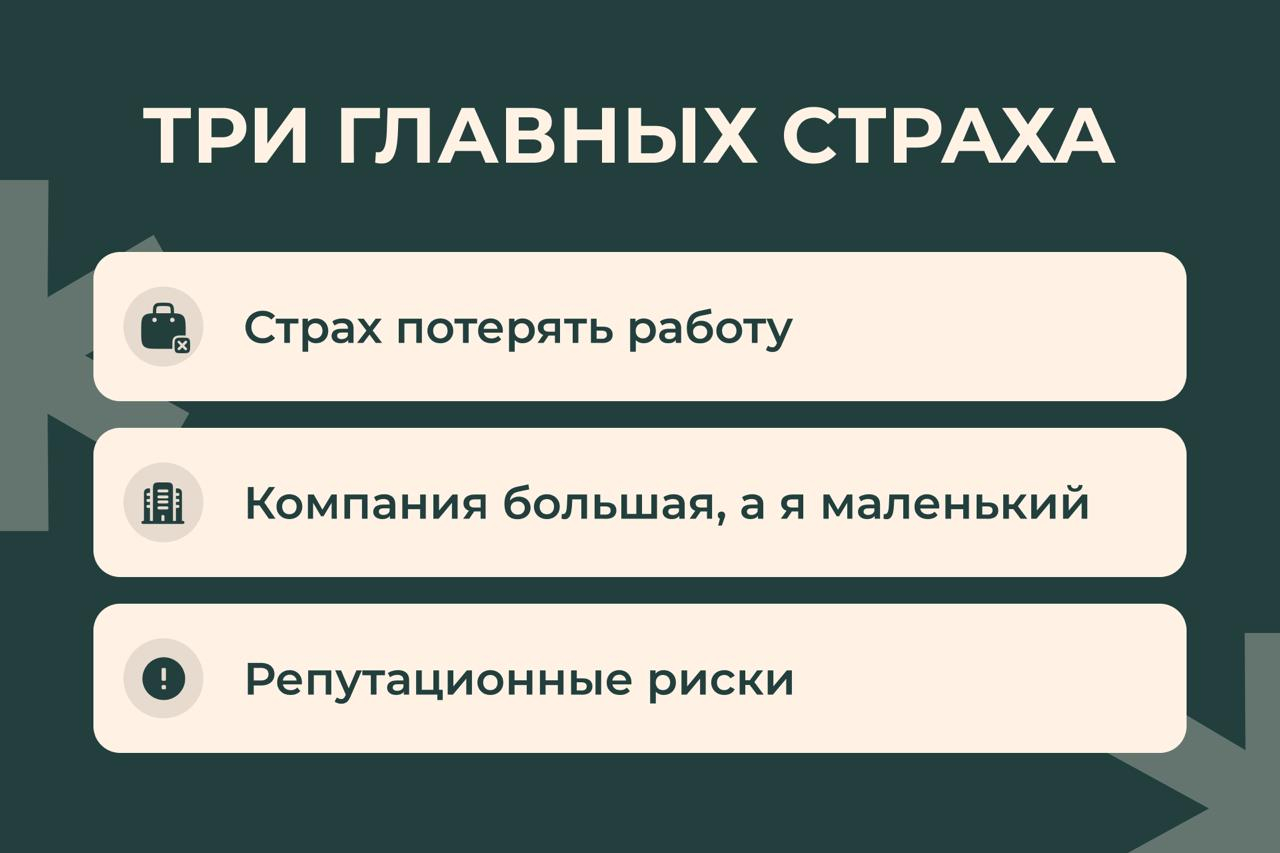 Сперва нужно понять корень проблемы. На моей практике сотрудники редко боятся реальности. Скорее они боятся собственных представлений о том, что может случиться. Например: «меня могут уволить», «мне испортят репутацию на рынке», «меня запомнят как неудобного сотрудника». Но теория почти никогда не происходит на практике — ведь довольно сложно представить, что нужно такого страшного сделать, чтобы сотрудника боялись нанимать, например, все EdTech-компании России. И тем не менее — три этих страха чаще всего не дают здраво оценить ситуацию.