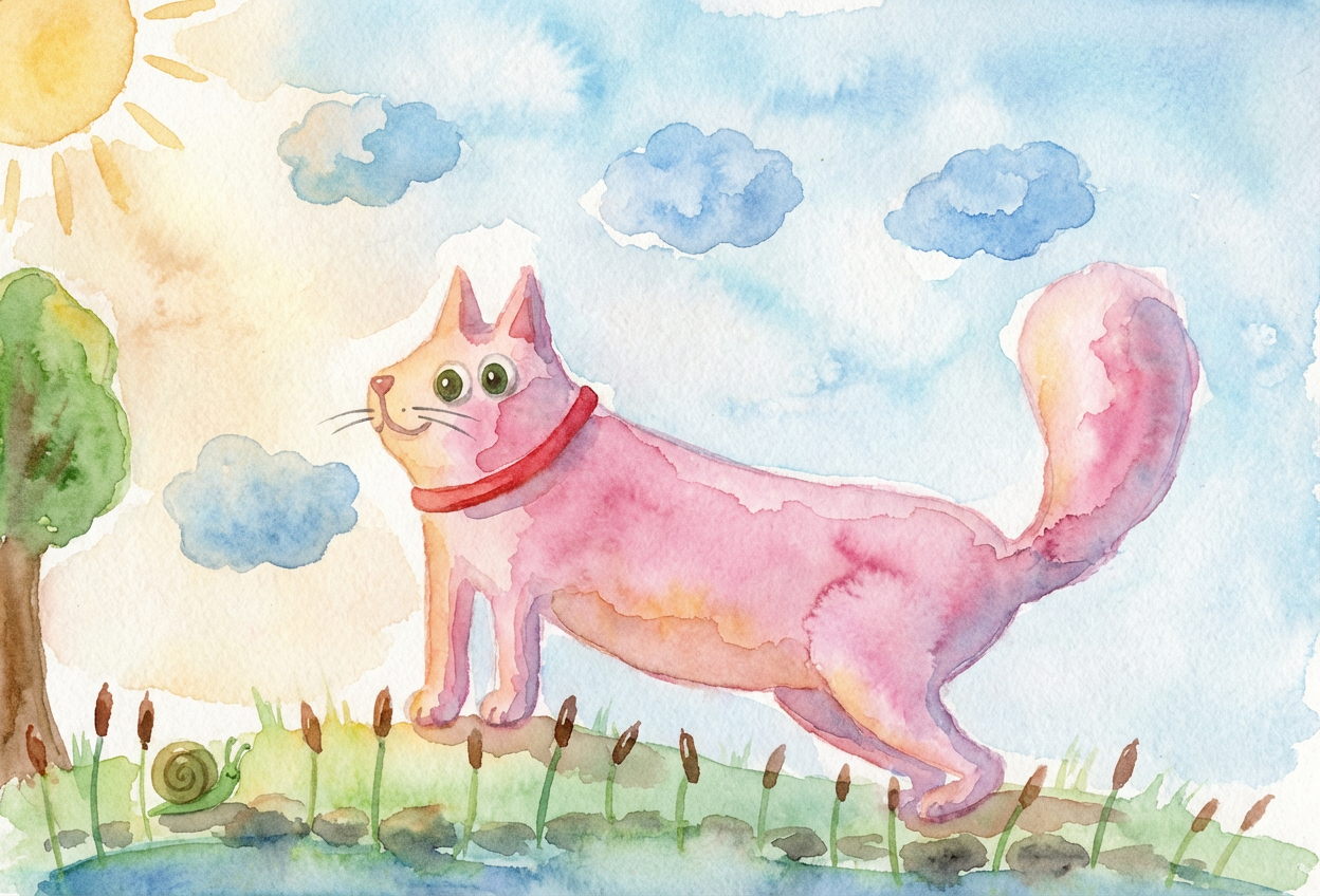 Преобразовать загруженный детский рисунок в профессиональную акварельную иллюстрацию для детской книги. Точно сохранить расположение всех элементов, пропорции и цветовую схему оригинального рисунка, даже если линии неровные или формы необычные. Не исправлять детские «ошибки», а подчеркнуть их шарм.