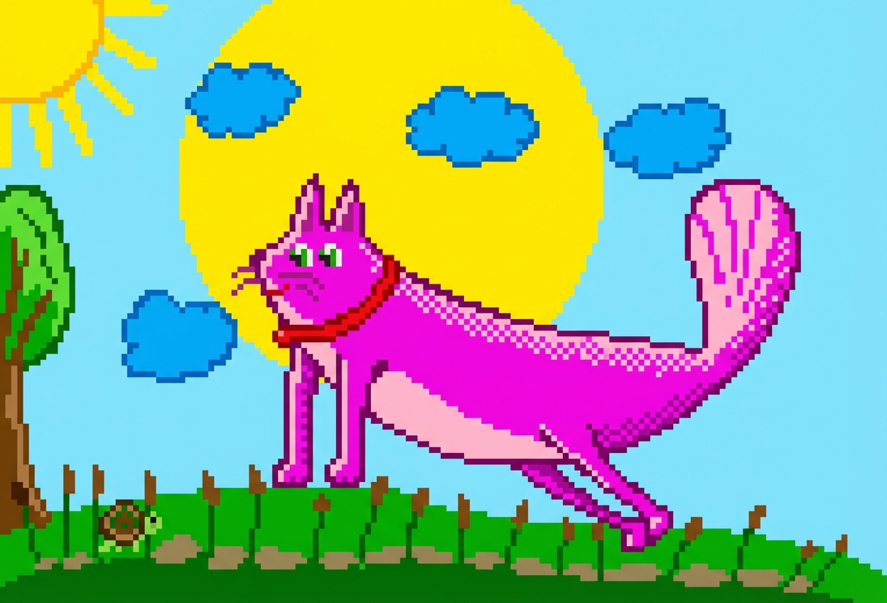 Сделать изображение из чётких пикселей (pixel perfect), без размытия и сглаживания, как скриншот из старой консоли. Использовать ограниченную палитру ярких насыщенных цветов. Для каждого крупного объекта применить 3–4 оттенка одного цвета: базовый тон, тень и блик, можно лёгкий dithering для текстур.
