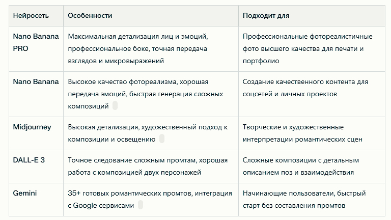 Для тренда "влюблённый взгляд" наиболее подходят Nano Banana PRO и Midjourney, так как они специализируются на максимальной детализации лиц и передаче тонких эмоций. Nano Banana PRO обеспечивает видимые блики в глазах, естественные микровыражения и реалистичную передачу направления взгляда. Midjourney отлично справляется с художественной интерпретацией эмоций и создаёт кинематографическую атмосферу. DALL-E 3 хорошо следует детальным описаниям эмоций в промте, но может уступать в фотореализме. Gemini подходит для начинающих благодаря готовым романтическим промтам, но детализация эмоций может быть ниже.