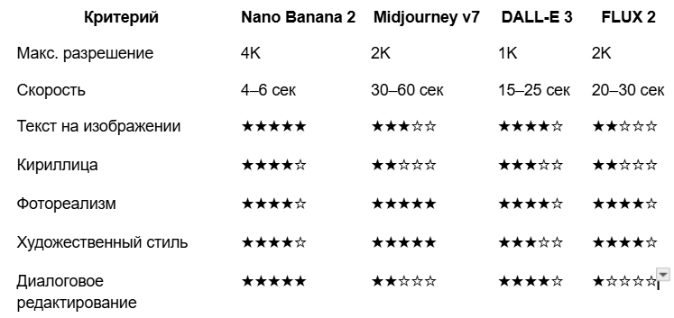 Главный вывод: Nano Banana 2 — лучший универсальный инструмент для тех, кто работает с текстом, редактирует изображения итеративно и ценит скорость. Midjourney остаётся выбором для чисто художественных задач, где важна эстетика «арт-стиля». FLUX 2 — достойная альтернатива при фотореализме, но проигрывает в смысловой работе с контентом.