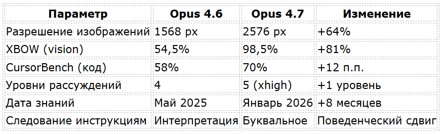 Opus 4.7 — это не минорный патч, а полноценный апгрейд сразу по четырём направлениям. Разберём каждое подробно.