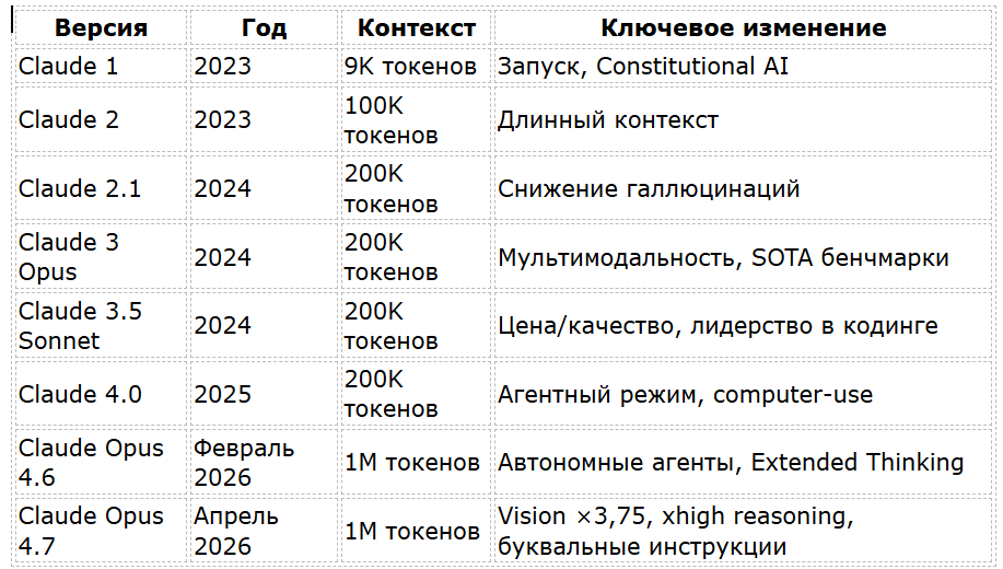 Чтобы понять, насколько значителен прогресс Claude Opus 4.7, важно посмотреть на весь путь модели — от скромного чат-бота 2023 года до автономного агента уровня 2026-го.