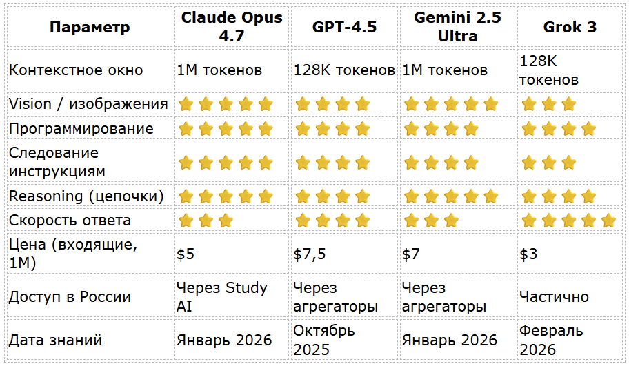 На апрель 2026 года у Claude Opus 4.7 есть три главных конкурента в сегменте топовых языковых моделей: GPT-4.5 от OpenAI, Gemini 2.5 Ultra от Google и Grok 3 от xAI. Каждый из них силён в своей нише — разберём, где Opus 4.7 выигрывает, а где уступает.