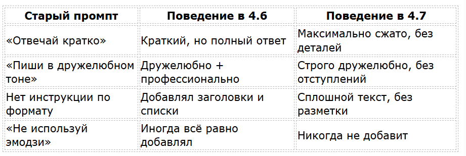 Новое поведение модели звучит как плюс, но создаёт неожиданные проблемы для старых промптов. Если раньше модель «догадывалась» о намерении и добавляла полезный контекст, теперь она делает ровно то, что написано — не больше и не меньше.