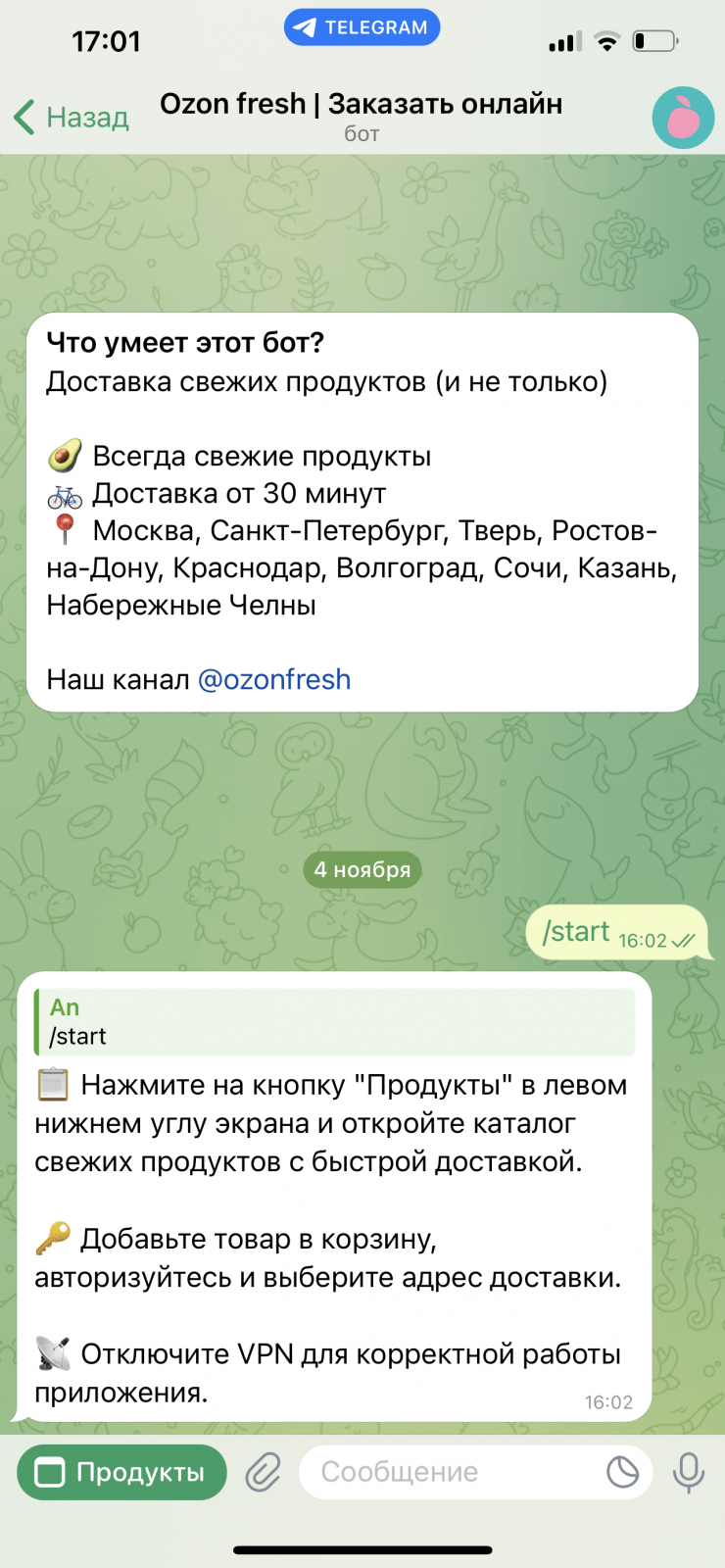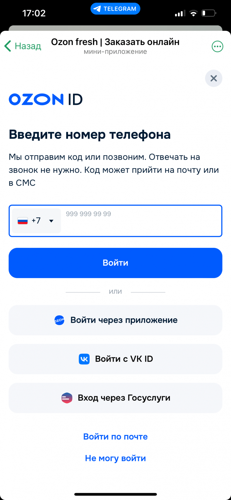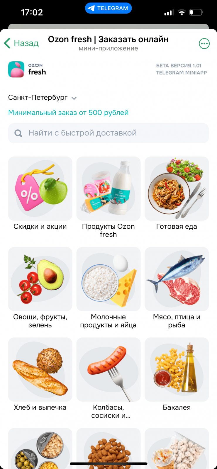 Хотя Telegram с конца 2024 года поддерживает Full-screen Mode, интерфейсы Ozon Fresh и ВкусВилл по-прежнему открываются в окне с верхней шторкой. Часть пространства теряется, и пользователь не чувствует полного погружения в магазин в Телеграмме.