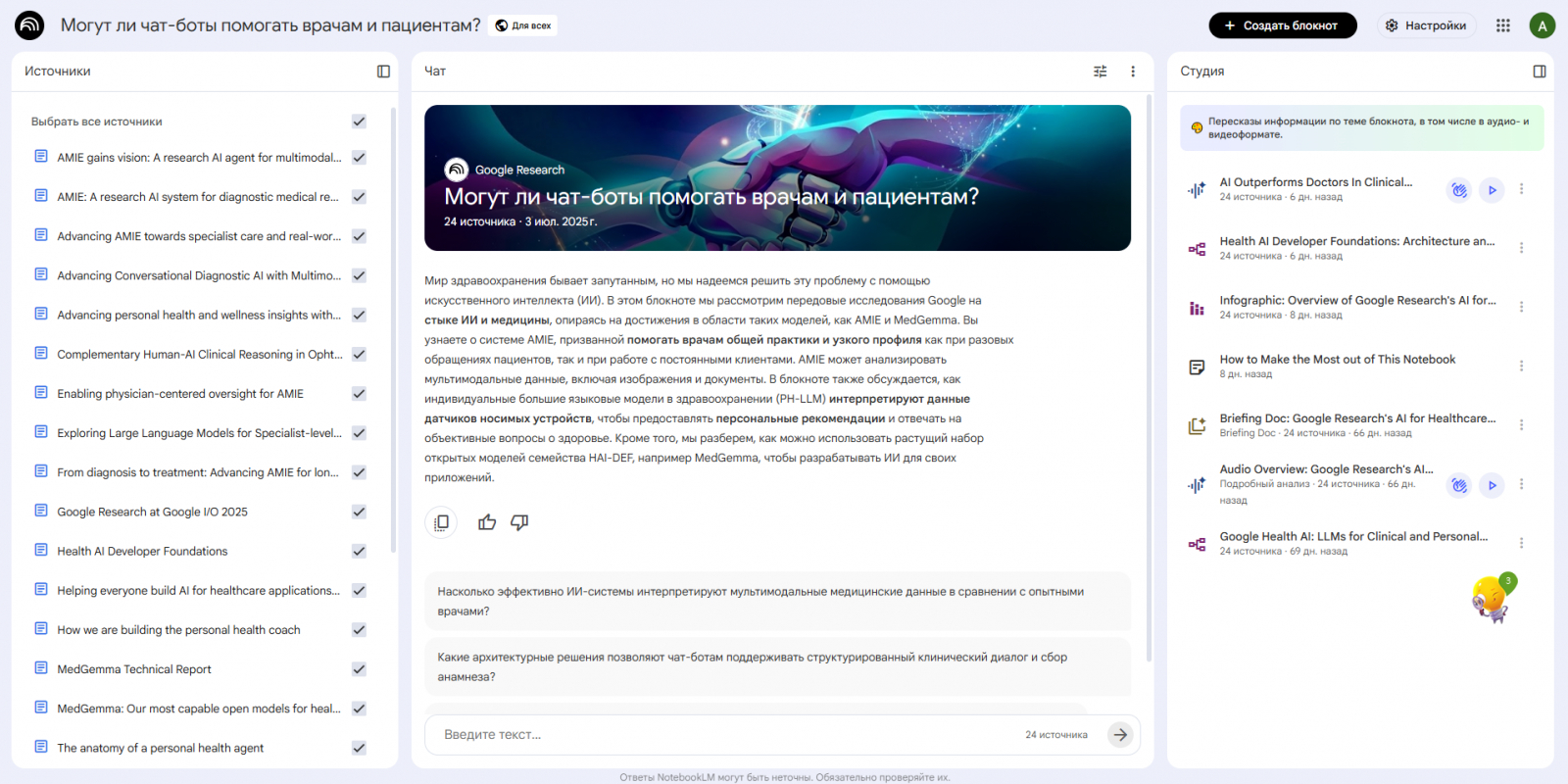 NotebookLM — это исследовательский инструмент от Google на базе языковой модели Gemini. Его ключевое отличие от других нейросетей в том, что он работает не со всей информацией из интернета, а только с теми источниками, которые вы ему загружаете.