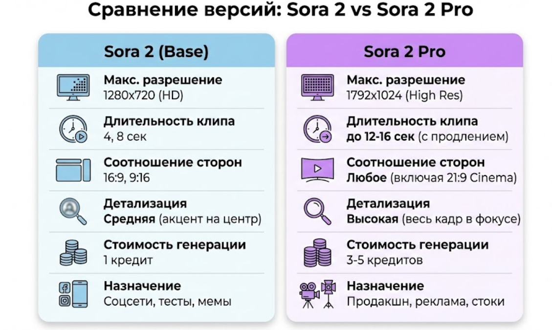 Pro-версия задействует полный стек вычислительных мощностей OpenAI. Это инструмент для тех, кому нужно создать видео в Sora 2 с коммерческим качеством (Broadcast Quality).