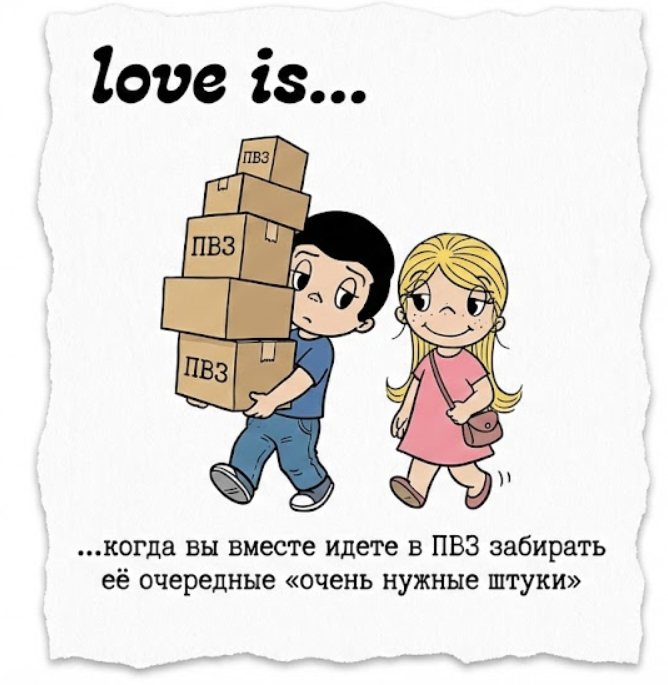 Иллюстрация в стиле бумажного вкладыша жвачки "Love is...". Рисовка Билла Эспри, плоские цвета, черный контур, белый фон. Парень (используй загруженные фото как референс внешности персонажа) несет огромную стопку коробок, девушка (используй загруженные фото как референс внешности персонажа) идет рядом довольная. Надпись сверху "love is...", внизу: "...когда вы вместе идете в ПВЗ забирать её очередные «очень нужные штуки»".
