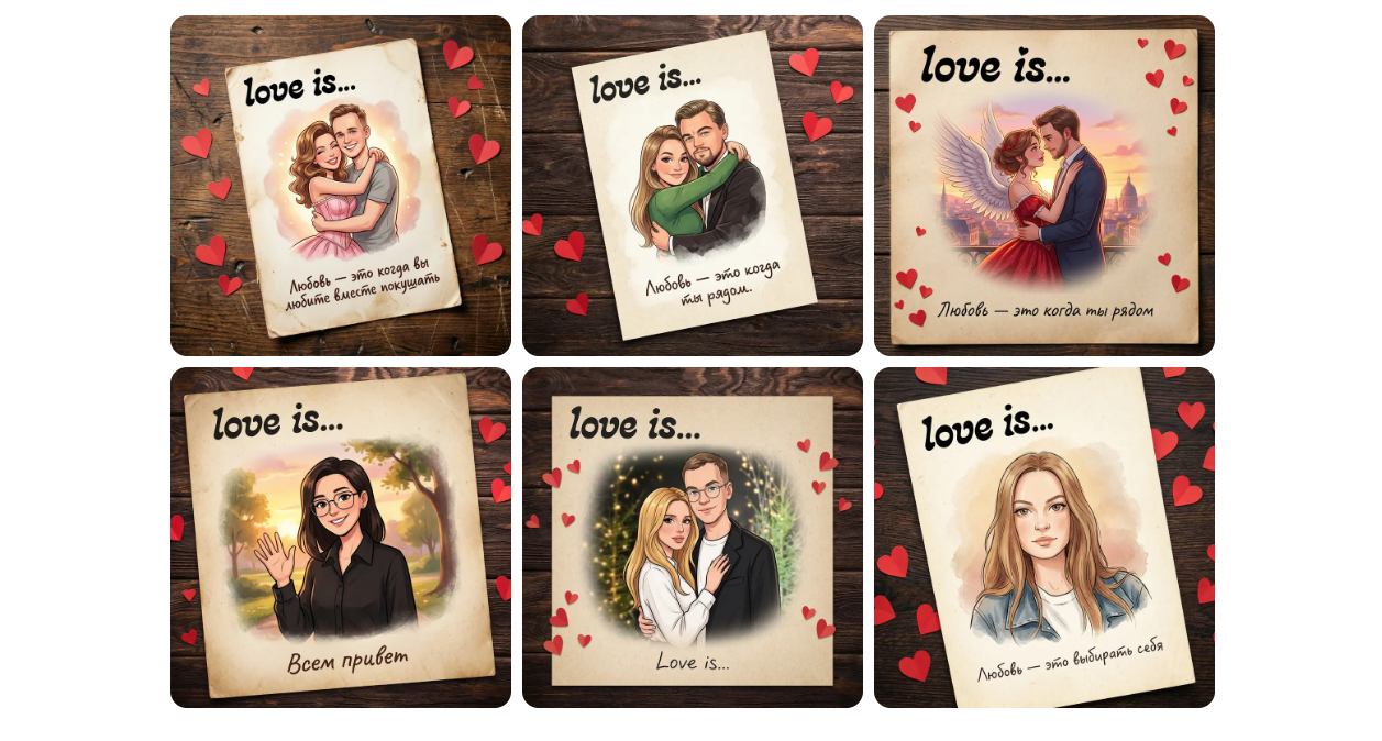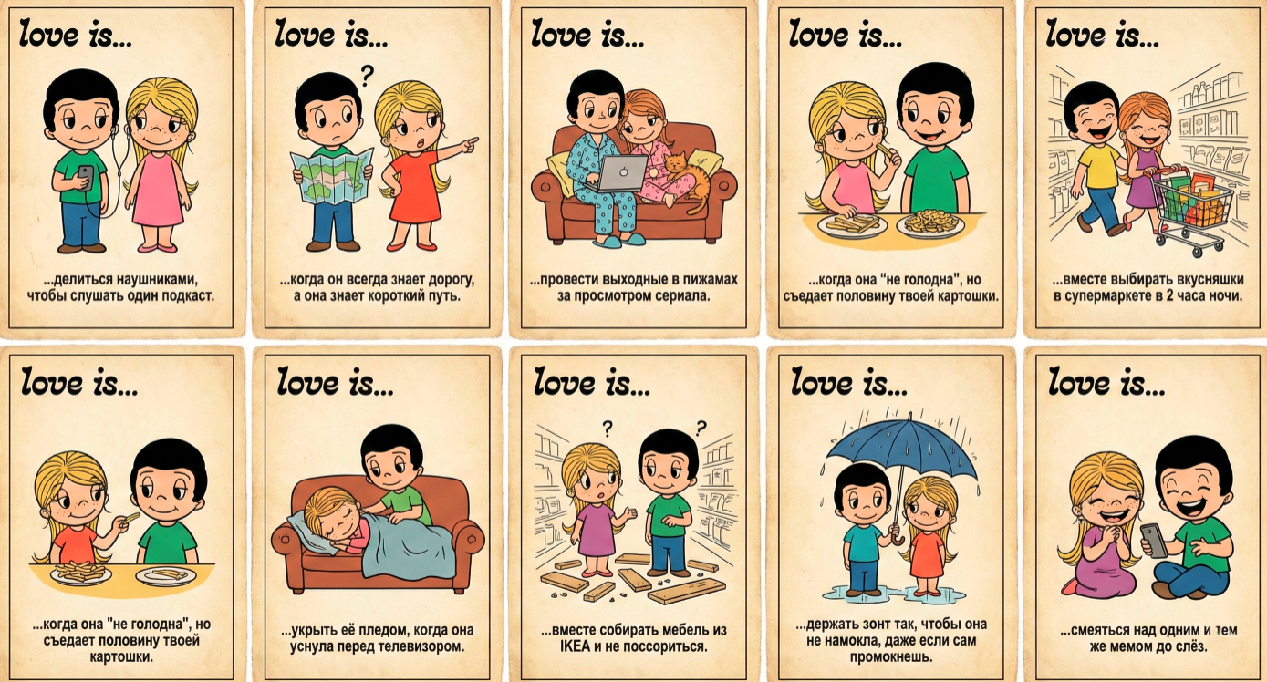 Тренд на генерацию фото в стиле "Love is" в 2026 году — это идеальное сочетание ностальгии и современных технологий. Для многих, кто вырос в 90-е, эти вкладыши были частью романтической культуры. Мы их собирали, обменивались, дарили. Сегодняшняя популярность — это желание поделиться тёплыми воспоминаниями с любимыми, но уже в новом, цифровом формате. Минималистичный и искренний стиль этих картинок выгодно отличается от глянцевых открыток, предлагая что-то более личное и душевное. А нейросети сделали этот процесс доступным для всех: больше не нужно быть художником, чтобы создать фото любовь это "Love is".