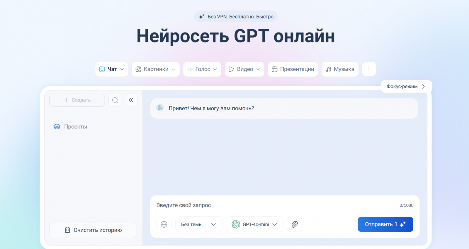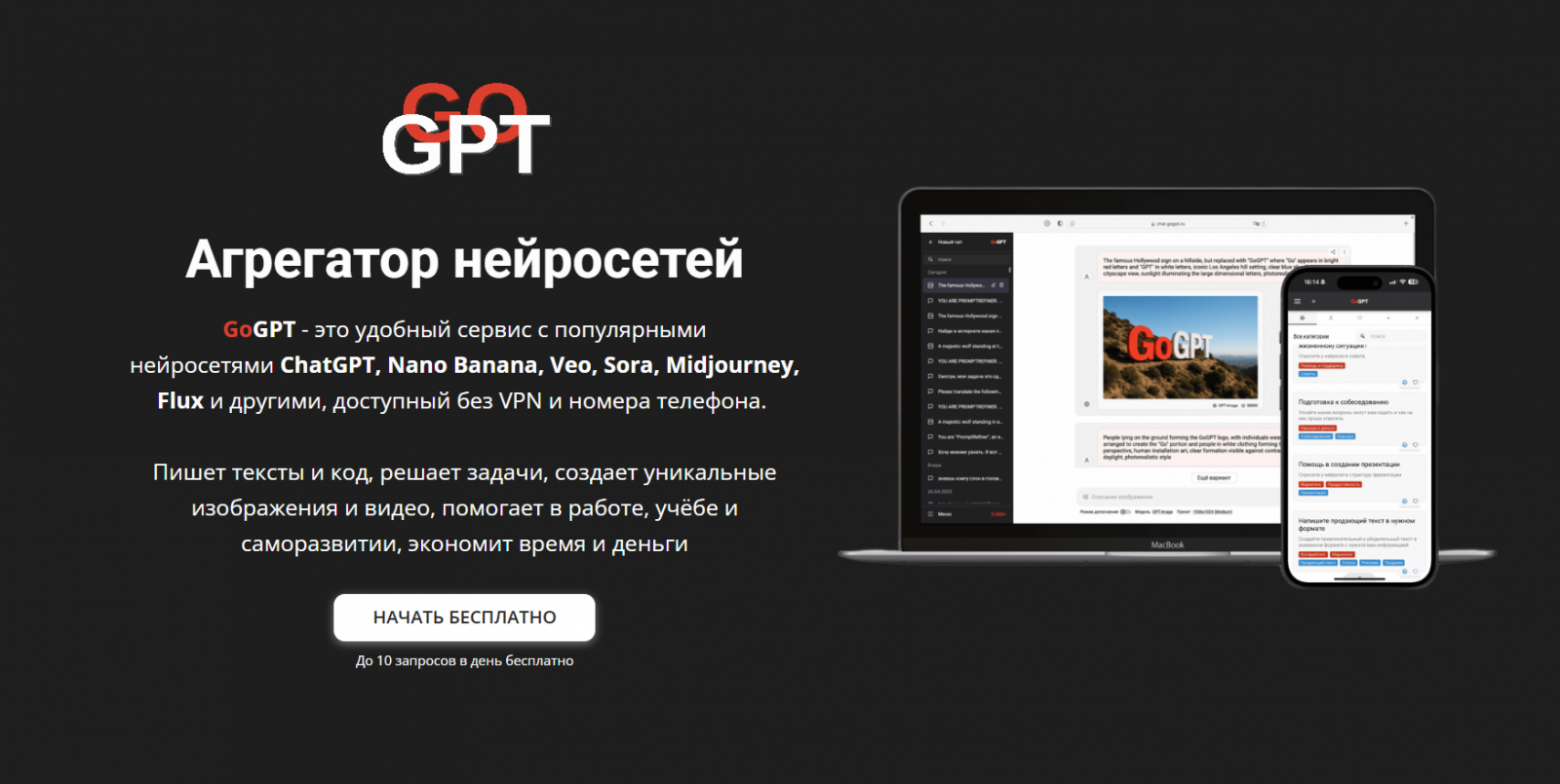 GoGPT — это максимально легкий и отзывчивый сборник всех ИИ. Платформа делает ставку на скорость запуска и отсутствие сложного онбординга: открыл сайт, выбрал нужную нейросеть, отправил запрос и мгновенно получил ответ. Это превосходный вариант для пользователей, которым требуется безотказный виртуальный ассистент для рутинных ежедневных задач.