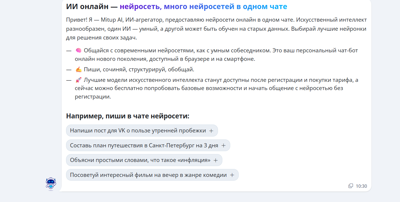 Если перед вами стоит задача системно внедрить искусственный интеллект в работу маркетингового отдела, службы поддержки или IT-подразделения, Mitup AI обеспечит надежный фундамент. Это полноценный энтерпрайз-инструмент.